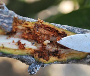 El daño inicia con la ovipostura, al remover la corteza de la rama o tronco para depositar los huevos bajo de ella. La entrada de la perforación se caracteriza inicialmente por puntos blancos de consistencia polvosa y posteriormente por la acumulación de aserrín y savia cristalizada que varía de color crema hasta café oscuro. Las larvas barrenan la rama hasta llegar a la médula, impidiendo la circulación de agua y nutrientes, por lo que se ocasiona defoliación, aborto de flores y frutos. También las ramas afectadas pueden secarse o romperse por el peso del fruto.